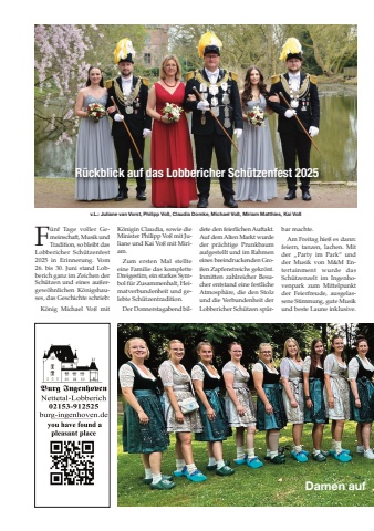 F%u00fcnf Tage voller Gemeinschaft, Musik undTradition, so bleibt dasLobbericher Sch%u00fctzenfest2025 in Erinnerung. Vom26. bis 30. Juni stand Lobberich ganz im Zeichen derSch%u00fctzen und eines au%u00dfergew%u00f6hnlichen K%u00f6nigshauses, das Geschichte schrieb:K%u00f6nig Michael Vo%u00df mitK%u00f6nigin Claudia, sowie dieMinister Philipp Vo%u00df mit Juliane und Kai Vo%u00df mit Miriam.Zum ersten Mal stellteeine Familie das kompletteDreigestirn, ein starkes Symbol f%u00fcr Zusammenhalt, Heimatverbundenheit und gelebte Sch%u00fctzentradition.Der Donnerstagabend bildete den feierlichen Auftakt.Auf dem Alten Markt wurdeder pr%u00e4chtige Prunkbaumaufgestellt und im Rahmeneines beeindruckenden Gro%u00dfen Zapfenstreichs gekr%u00f6nt.Inmitten zahlreicher Besucher entstand eine festlicheAtmosph%u00e4re, die den Stolzund die Verbundenheit derLobbericher Sch%u00fctzen sp%u00fcrbar machte.Am Freitag hie%u00df es dann:feiern, tanzen, lachen. Mitder %u201eParty im Park%u201c undder Musik von M&M Entertainment wurde dasSch%u00fctzenzelt im Ingenhovenpark zum Mittelpunktder Feierfreude, ausgelassene Stimmung, gute Musikund beste Laune inklusive.R%u00fcckblick auf das Lobbericher Sch%u00fctzenfest 2025v.L.: Juliane van Vorst, Philipp Vo%u00df, Claudia Domke, Michael Vo%u00df, Miriam Matthies, Kai Vo%u00dfDamen auf