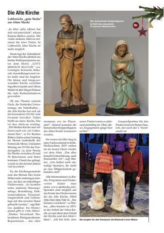 %u201eIn %u00fcber zehn Jahren hatsich viel entwickelt%u201c, schautBastian R%u00fctten zur%u00fcck. Mitvielen anderen Aktiven entstand die leise Vision: InLobberichs Alter Kirche istmehr m%u00f6glich. Heute legt der Arbeitskreisder Alten Kirche j%u00e4hrlich einbreites Kulturprogramm unter dem Motto %u201eGOTTMENSCH KULTUR%u201c vor.Lesungen, Konzerte, Kabarett, Ausstellungen und vieles mehr sind im Angebot.Die kleine und kriegsverwundete Kirche zwischenIngenhovenpark und AltemMarkt ist aber l%u00e4ngst Heimatf%u00fcr viele Kulturinitiativengeworden. Ob das Theater untermDach, die Nettetaler Literaturtage, die NetteKultur%u2026die Alte Kirche hat sich alsein besonderer Ort f%u00fcr vieleFormate bew%u00e4hrt. Dabeibleibt sie eines: Kirche. Dasist den Aktiven wichtig.%u201eWir bleiben Kirche und wirfeiern nach wie vor Gottesdienst hier%u201c, so Dr. BastianR%u00fctten. Jeden ersten Sonntagim Monat (au%u00dferhalb derFerien) die Messe. Und jedenMontag um 19 Uhr das Friedensgebet, zu dem Wochef%u00fcr Woche zwischen 20 und50 Beterinnen und Beterkommen. Damit das gelingt,wurde in den letzten Jahrenviel investiert. Da die Kirchengemeindeund das Bistum hier keineMittel mehr einbringen k%u00f6nnen, tut dies ein tatkr%u00e4ftigerF%u00f6rderverein. %u201eSo konntenunter anderem Heizungsanlage, Bestuhlung, Elektroinstallation, Veranstaltungstechnik und Lichtanlage auf den neusten Standgebracht werden.%u201c, sagt R%u00fctten dankbar. Im Hintergrund gibt es viele Aktive.%u201eEinlass, Vorverkauf, Thekendienst, Reinigunsdienste,Reparaturen%u2026 das allesDie Alte KircheLobberichs %u201egute Stube%u201c am Alten Markt 1 5stemmen wir im Ehrenamt!%u201c. Zuletzt konnten diehistorischen Krippenfigurender Alten Kirche restauriertwerden. Sie waren ein Jahr lang ineiner Fachwerkstatt in K%u00f6ln.Weihnachten 2025 stehensie im neuen Glanz wiedervor dem Altar. %u201eDas allesbraucht Unterst%u00fctzung, auchfinanzieller Art%u201c, sagt R%u00fctten. %u201eUns helfen auch einmalige Spenden, die nichtan eine Mitgliedschaft gebunden sind%u201c. Alle Informationen zu Kirche, Programm und F%u00f6rderverein findet manunter www.altekirche,info.Spenden sind m%u00f6glich aufdas Konto des F%u00f6rdervereinsf%u00fcr die Alte Kirche, DE643206 0362 2006 7040 10. %u201eWirk%u00f6nnen versichern%u201c, so R%u00fctten, %u201ealles kommt zu 100%in der Arbeit der Alten Kirche an und dient dem Erhaltder Kirche und den Aktivit%u00e4ten%u201c. %u201eIch bin froh, dassunser F%u00f6rderverein so aktivund umtriebig ist. Ohne dieses Engagement ginge hiernichts!%u201c. Ansprechpartner f%u00fcr denF%u00f6rderverein ist Stefan Hauertz, der auch der 1. Vorsitzende ist.Die restaurierten Krippenfiguren. Es fehlt das Jesuskind. Es kommt: Weihnachten.Sie sorgten f%u00fcr den Transport: die Eheleute L%u00f6ser-Widua