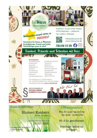 FOLLOW US ONMarktstr. 42 (am Alter Markt)41334 Nettetal %u2013 LobberichTel.: 02153 / 9595365Feinkost, Pr%u00e4sente und Schenken mit Herzinfo@talwuerze.dewww.talwuerze.de Verschenken Sie Genuss an Mitarbeiter, Gesch%u00e4ftskunden, Freunde und Familie.Vorbestellungen gerne ab sofort!Weihnachten kommt immer so PL%u00d6TZLICH!