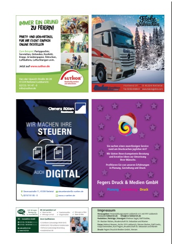 ImpressumHerausgeber: Veranstaltungsverein Lobberich e.V. mit VVV Lobberich www.vvv%u2010lobberich.de info@vvv%u2010lobberich.deRedaktion / Beitr%u00e4ge / Anzeigen: Dietmar Sagel, Ralf Stobbe, Dr. Bastian R%u00fctten, Bruderschaft St. Sebastian und MarienFotos: Helmut Heesen, Archiv VVV%u2010Lobberich, Werner Backes, Ralf Geritz,Katja Oemmelen, Kurt Fegers, Bruderschaft St. Sebastian und MarienDruck: Fegers Druck & Medien GmbH, ViersenSie suchen einen zuverl%u00e4ssigen Service rund um Drucksachen jeglicher Art?Wir bieten Ihnen kompetente Beratung und kreative Ideen zur Umsetzung Ihrer W%u00fcnsche.Profitieren Sie von unseren Erfahrungen in Planung, Gestaltung und Druck.Fegers Druck & Medien GmbHPlanung %u00b7 Gestaltung %u00b7 DruckAUCH DIGITALWIR MACHEN IHRE STEUERNwww.c-ruetten.deSeverusstra%u00dfe 11, 41334 Nettetal02157 81 85 - 0steuerberater@c-ruetten.de