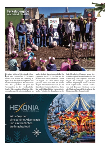 2 3In einer kleinen Feierstunde %u00fcbergab der Lobbericher VVV-Vorsitzende Ralf Stobbe am Sonntag, 6.April 2025 drei Ferkelskulpturen ausRochlitzer Porphyr an die Stadt Nettetal. Ihr %u201eSaustall%u201c ist jetzt derNaschgarten in der von-BocholtzStra%u00dfe. B%u00fcrgermeister Christian K%u00fcsters nahm das Geschenk dankend anund w%u00fcrdigte das ehrenamtliche Engagement des VVV. Ute Neu als Repr%u00e4sentantin der f%u00f6rdernden LEADER Region Lei.La war ebenso zugegen und freute sich %u00fcber das sch%u00f6neProjekt. Herzlichen Dank an die Fa.Kalenborn Steinmetzbetriebe, Rochlitz und Fabian P%u00fctter Natursteinbetriebe, Nettetal, f%u00fcr die gelungene Arbeit. Herzlichen Dank an unser Vorstandsmitglied Werner Backes f%u00fcr dieUmsetzung des Projektes. Zum Gelingen des heutigen Tages habenebenso beigetragen: Greta van-derBeek Optendrenk, Fabian Matussek mit Johannes Gorissen sowiedie Malteser Jugend Nettetal und dieKinder der Kita Bongartzstift.Ferkel%u00fcbergabezum Nettetal - Tag 2025