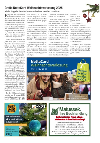 F%u00fcr jeden der fast 12.500Kartenbesitzerinnen und-besitzer hat sich das Teamder NetteCard wieder etwasBesonderes f%u00fcr die Vorweihnachtszeit %u00fcberlegt. Wer biszum 31. Dezember 2025 inden teilnehmenden Gesch%u00e4ften punktet, erh%u00e4lt die Chance, einen der wertvollenPreise im Wert von %u00fcber7.000 Euro zu gewinnen. Zum Weihnachtsfest imJahr 2025 gibt es wiederdoppelte Gewinnchancen:Schon ab dem 15.11.2025,dem ersten Tag der Weihnachtsverlosung, hat jederNutzende der NetteCarddie Chance auf einen Sofortgewinn. 1.500 Bonuspunkte, also umgerechnet15 Euro, werden jedemzwanzigsten Einkauf bei einem der NetteCard-Partnerautomatisch der Karte gutgeschrieben. Die Gewinnerinnen und Gewinner werden noch im Gesch%u00e4ft %u00fcberihren Gewinn informiert.Zudem nimmt jede Kundinund jeder Kunde mit allenLosen, die im Aktionszeitraum gesammelt wurden,automatisch an der Schlussverlosung teilt. Ein Los entspricht hierbei einem Einkaufswert von einem Euro. Bei der Schlussverlosungwerden am 2. Januar 2026sechs Hauptgewinne verlost: 1 x 500 Euro, 2 x 250Euro sowie 3 x 125 Eurowerden im Januar als Guthaben automatisch auf den%u201eGewinner%u201c-Karten gutgeschrieben.Die Gewinnerinnen undGewinner werden automatisch per E-Mail informiertoder k%u00f6nnen, durch Eingabeder Kartennummer unter ,einen m%u00f6glichen Gewinnabfragen. Die Aktion l%u00e4uftbis zum 31. Dezember 2025.Die Schlussverlosung erfolgt unter registrierten Karten. Wer seine Karte nochnicht registriert hat, kanndieses jederzeit unter oderin jedem Mitgliedsgesch%u00e4fterledigen.Sinnvoll schenken: Gutschein aus der HeimatWer nicht sicher ist, waser Weihnachten verschenkensoll, kann einen Gutscheinkaufen. Und zwar einen,der die lokale Wirtschaftst%u00e4rkt %u2013 ob im NetteCardOnline-Shop oder in denGesch%u00e4ften. NetteCard-Gutscheine k%u00f6nnen bei allenteilnehmenden Partnern erworben werden. Dort k%u00f6nnen die Kartenmit einem beliebigen Betragzwischen f%u00fcnf und 100 Euroaufgeladen werden. Alternativ k%u00f6nnen die Gutscheineauch auf der Internetseitezum Ausdrucken bezogenwerden %u2013falls es malganz schnellgehen muss.GeschenkGutscheine k%u00f6nnenbei allen teilnehmendenPartnern eingel%u00f6st werden.Auch Teileinl%u00f6sungen sindm%u00f6glich. Solange der Betragbeim Einkauf nicht komplettaufgebraucht wird, bleibtdas Rest-Guthaben auf derKarte bestehen. Den Stand des Gutscheinskann man jederzeit selbstpr%u00fcfen, indem man den QRCode mit dem mobilen Endger%u00e4t scannt. Gro%u00dfe NetteCard Weihnachtsverlosung 2025wieder doppelte Gewinnchancen %u2013 Gewinne von %u00fcber 7.000 Euro0DUNWVWUD%u0089H%u0003%u0014%u0016%u0003%u0101%u0003%u0017%u0014%u0016%u0016%u0017%u00031HWWHWDO%u0010/REEHULFK%u0013%u0015%u0014%u0018%u0016%u0003ffi%u0014%u0019%u0017%u0016%u0013%u0003%u0101%u0003EXFKPDWXVVHN#W%u0010RQOLQH%u0011GHZZZ%u0011EXFKKDQGOXQJ%u0010PDWXVVHN%u0011GH0DWXVVHN%u0011 DWXVVHN%u0011 %u0018%u015d%u011e%u0003%u0011%u01b5%u0110%u015a%u015a%u0102%u0176%u011a%u016f%u01b5%u0176%u0150%u0358 ,KUH%u0003%XFKKDQGOXQJ%u00110R%u0003%u0010%u0003)Uffl%u0003ffi%u0003%u0010%u0003%u0014%u0015ffl%u0016%u0013%u0003%u000e%u0003%u0014%u0017ffl%u0016%u0013%u0003%u0010%u0003%u0014fl%u00038KU%u0003_%u00036Dffl%u0003ffi%u0003%u0010%u0003%u0014%u0016%u00038KU$Q%u0003GHQ%u0003$GYHQWVVDPVWDJHQ%u0003GXUFKJHKHQG%u0003ELV%u0003%u0014%u0019%u00038KU%u0003JH|IIQHW%u00049RP%u0003%u0014%u0018%u0011%u0003ELV%u0003%u0015%u0016%u0011%u0003'H]HPEHU%u0003GXUFKJHKHQG%u0003JH|IIQHW%u0004%%u0081FKHU%u0003VFKHQNHQ%u000f%u0003) %%u0081FKHU%u0003VFKHQNHQ%u000f%u0003)UHXGH%u0003HUOHEHQ%u0003%u00b2 UHXGH%u0003HUOHEHQ%u0003%u00b2:HLKQDFKWHQ%u0003LQ%u0003,KUHU%u0003%XFKKDQGOXQJ%u0004 HLKQDFKWHQ%u0003LQ%u0003,KUHU%u0003%XFKKDQGOXQJ%u0004 2 7