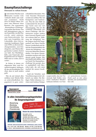 2 9 In den letzten Wochen undMonaten wurden vielevielleicht direkt oder indirekt %u201enominiert%u201c. Nichtetwa zu einem Oskar, sondern zum Pflanzen einesBaumes. Die sogenannte%u201eBaumpflanz-Challenge%u201czog munter ihre Kreise: Vonden Kleing%u00e4rtnern ging eszur Feuerwehr, von der Feuerwehr -unter anderemzum Karnevalsverein. Vondort zum Gospelchor, derLebenshilfe, dem Ortsvorstand der Landfrauen. Dannzum THW, zu diversen Kirchengemeinden, zum Kindergarten, zum Pfarrer, B%u00fcrgermeister, Landrat. Zur%u00fcckzur Tafel. Zur Fl%u00fcchtlingshilfe, zum Trauercaf%u00e9, demKegelclub und zur NigeriaHilfe und so weiter, und soweiter%u2026 In Zeiten, in denen wirallgemeine Mut- und Perspektivlosigkeit beklagen,ist das ein beachtliches Zeichen, dass es auch andersgeht. Was da auf einmal allessichtbar wird. Welche F%u00fcllean unterschiedlichem Engagement in ganz unterschiedlichen Bereichen. Wieviele Stunden Ehrenamtwerden da sichtbar. Wie vielKompetenz und Fachwissen. Was f%u00fcr eine F%u00fclle anLeidenschaft f%u00fcr die jeweilige Sache und wie viel%u00dcberzeugung. Das ist diewirkliche Erkenntnis ausdieser Challenge. Alle Nominierten tragen (nebendem Umwelt-Aspekt) nochein weiteres Mal zur %u201eWahrung der Sch%u00f6pfung%u201c bei.Sie pr%u00e4gen durch ihr Engagement und ihren Einsatzunsere Gesellschaft und damit das Zusammenleben der%u201eKrone der Sch%u00f6pfung%u201c, wiewir ja uns Menschen nennend%u00fcrfen. Um dieses Zusammenleben machen sich vielederzeit gro%u00dfe Sorgen. Wirsind damit nicht alleine. Gottsei Dank! Die Baumpflanzchallenge hat gezeigt, dasses unglaublich viele Menschen gibt, die sich starkmachen f%u00fcr unsere Gesellschaft.Auch der Verkehrs- undVersch%u00f6nerungsverein Lobberich war dabei. Die flei%u00dfigen Helfer Johannes Gorissen und Andreas HartgesBaumpflanzchallengeEhrenamt in vollem Einsatzsorgten daf%u00fcr, dass der Vorsitzende Ralf Stobbe stolzeinen stattlichen Mirabellenbaum (Sch%u00f6ne von Nancy) pr%u00e4sentieren konnte.Dank auch an den edlenSpender, der unerkannt bleiben will.