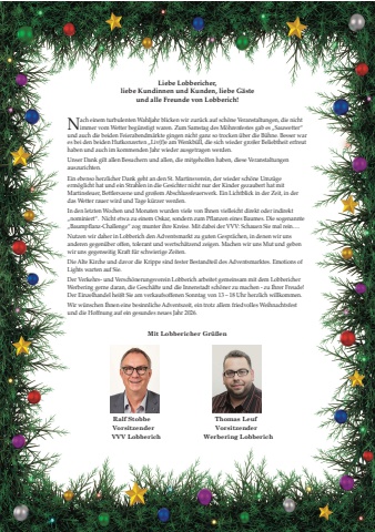 Liebe Lobbericher,liebe Kundinnen und Kunden, liebe G%u00e4steund alle Freunde von Lobberich!Nach einem turbulenten Wahljahr blicken wir zur%u00fcck auf sch%u00f6ne Veranstaltungen, die nichtimmer vom Wetter beg%u00fcnstigt waren. Zum Samstag des M%u00f6hrenfestes gab es %u201eSauwetter%u201cund auch die beiden Feierabendm%u00e4rkte gingen nicht ganz so trocken %u00fcber die B%u00fchne. Besser wares bei den beiden Hutkonzerten %u201eLiv(f)e am Wenkb%u00fcll, die sich wieder gro%u00dfer Beliebtheit erfreuthaben und auch im kommenden Jahr wieder ausgetragen werden.Unser Dank gilt allen Besuchern und allen, die mitgeholfen haben, diese Veranstaltungenauszurichten.Ein ebenso herzlicher Dank geht an den St. Martinsverein, der wieder sch%u00f6ne Umz%u00fcgeerm%u00f6glicht hat und ein Strahlen in die Gesichter nicht nur der Kinder gezaubert hat mitMartinsfeuer, Bettlerszene und gro%u00dfem Abschlussfeuerwerk. Ein Lichtblick in der Zeit, in derdas Wetter rauer wird und Tage k%u00fcrzer werden. In den letzten Wochen und Monaten wurden viele von Ihnen vielleicht direkt oder indirekt%u201enominiert%u201c. Nicht etwa zu einem Oskar, sondern zum Pflanzen eines Baumes. Die sogenannte%u201eBaumpflanz-Challenge%u201c zog munter ihre Kreise. Mit dabei der VVV: Schauen Sie mal rein%u2026.Nutzen wir daher in Lobberich den Adventsmarkt zu guten Gespr%u00e4chen, in denen wir unsanderen gegen%u00fcber offen, tolerant und wertsch%u00e4tzend zeigen. Machen wir uns Mut und gebenwir uns gegenseitig Kraft f%u00fcr schwierige Zeiten. Die Alte Kirche und davor die Krippe sind fester Bestandteil des Adventsmarktes. Emotions ofLights warten auf Sie. Der Verkehrs- und Versch%u00f6nerungsverein Lobberich arbeitet gemeinsam mit dem LobbericherWerbering gerne daran, die Gesch%u00e4fte und die Innenstadt sch%u00f6ner zu machen - zu Ihrer Freude!Der Einzelhandel hei%u00dft Sie am verkaufsoffenen Sonntag von 13 %u2013 18 Uhr herzlich willkommen. Wir w%u00fcnschen Ihnen eine besinnliche Adventszeit, ein trotz allem friedvolles Weihnachtsfestund die Hoffnung auf ein gesundes neues Jahr 2026.Mit Lobbericher Gr%u00fc%u00dfenRalf Stobbe Thomas LeufVorsitzender VorsitzenderVVV Lobberich Werbering Lobberich